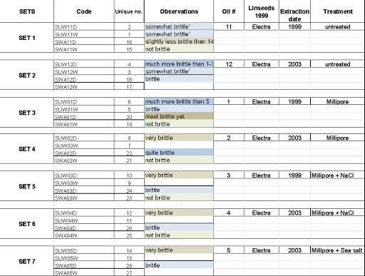 A total of 28 oil paints were prepared using water-washed oils and untreated oil (see summary Table 1). The paints were divided into sets according to the oil used (Table 5a). The oil treatments selected were as follows: washed with Millipore water alone (#1 & #2); Millipore water + pure sodium chloride (#3 & #4); Millipore water + sea-salt (#5); and untreated oils, one extracted in 1999 (#11) and one extracted in 2003 (#12). The oils are summarised in Table 4, and the paints in Table 5a.