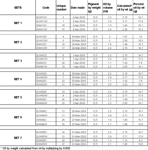 Oil paints were prepared between March 24th and April 3rd 2003, taking a total of 8 days for all 28 paints to be hand-ground and applied to the substrates (see Chapter 1 Appendix Master List of HART Projects). Each paint was applied to its set of substrates (Table 5b) immediately after it was ground (Powerpoint 04). Paint within each set was prepared in a standard order to minimize contamination from residue on the granite slab from previous grinding. Therefore, the washed pigment was ground first, followed by the unwashed pigment: